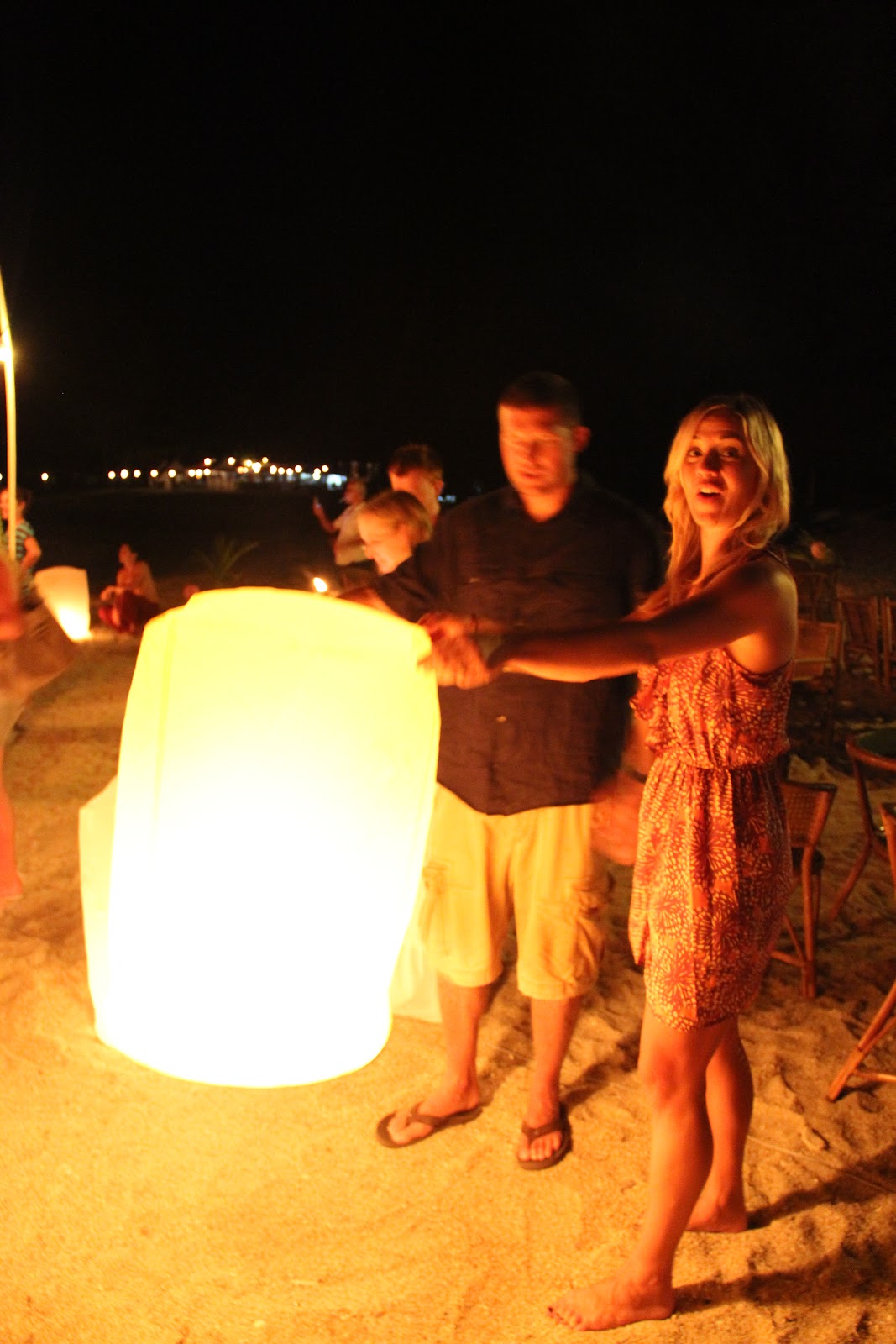 The next day was much of the same. Emily and I spent a lot of time reading on our Kindles, swimming, eating, napping.....really grueling activities. It was our tour leader's birthday as well as another girl in our group so we celebrated with an awesome beach bbq. The coolest part about the night, and one of the coolest things we've done on the whole trip was after dinner as everyone got to release floating lanterns into the sky over the water. The pictures don't do justice to how beautiful and amazing it looked to see all the flaming lanterns float up into the black night sky and drift higher and farther out to sea.